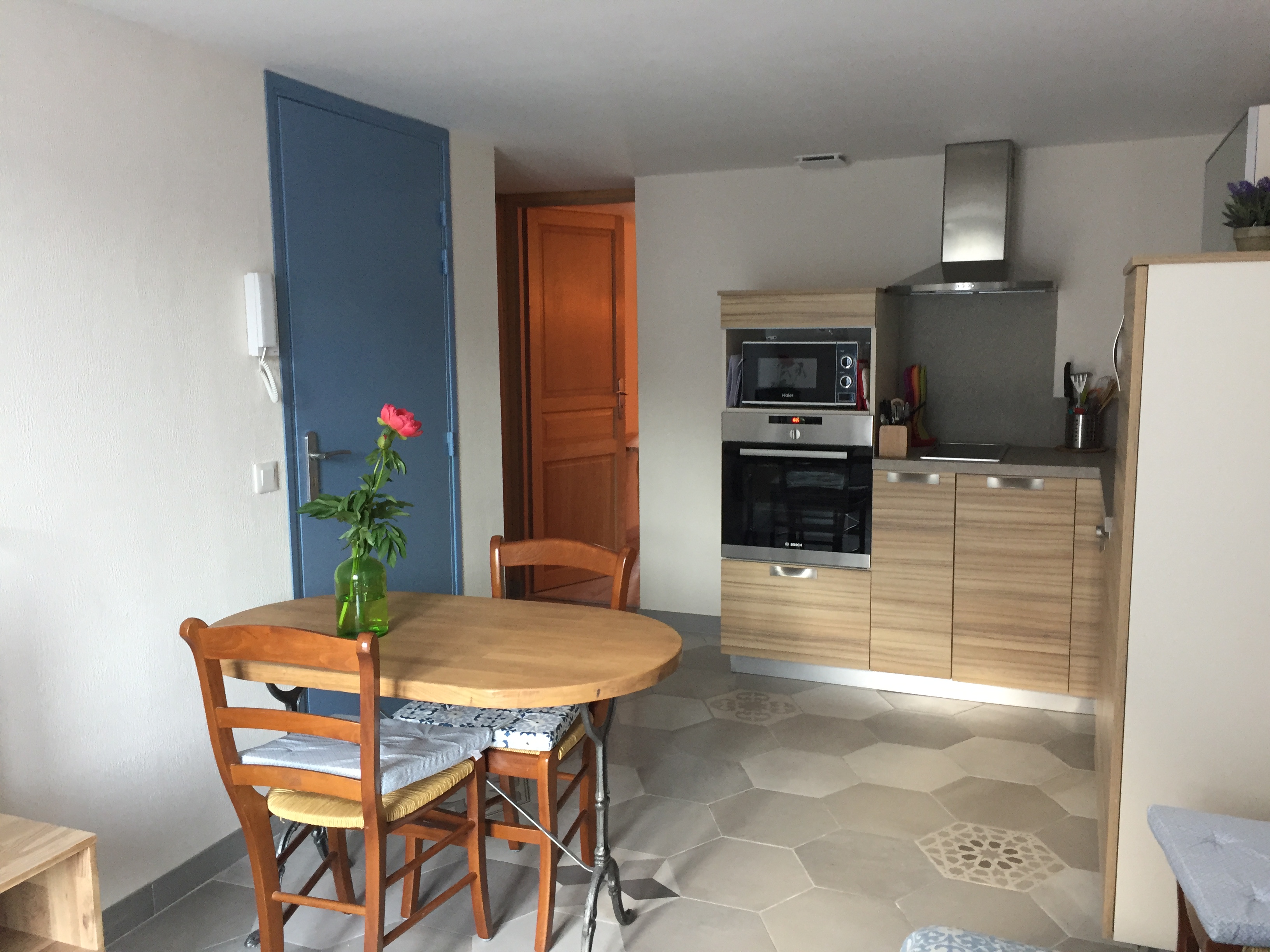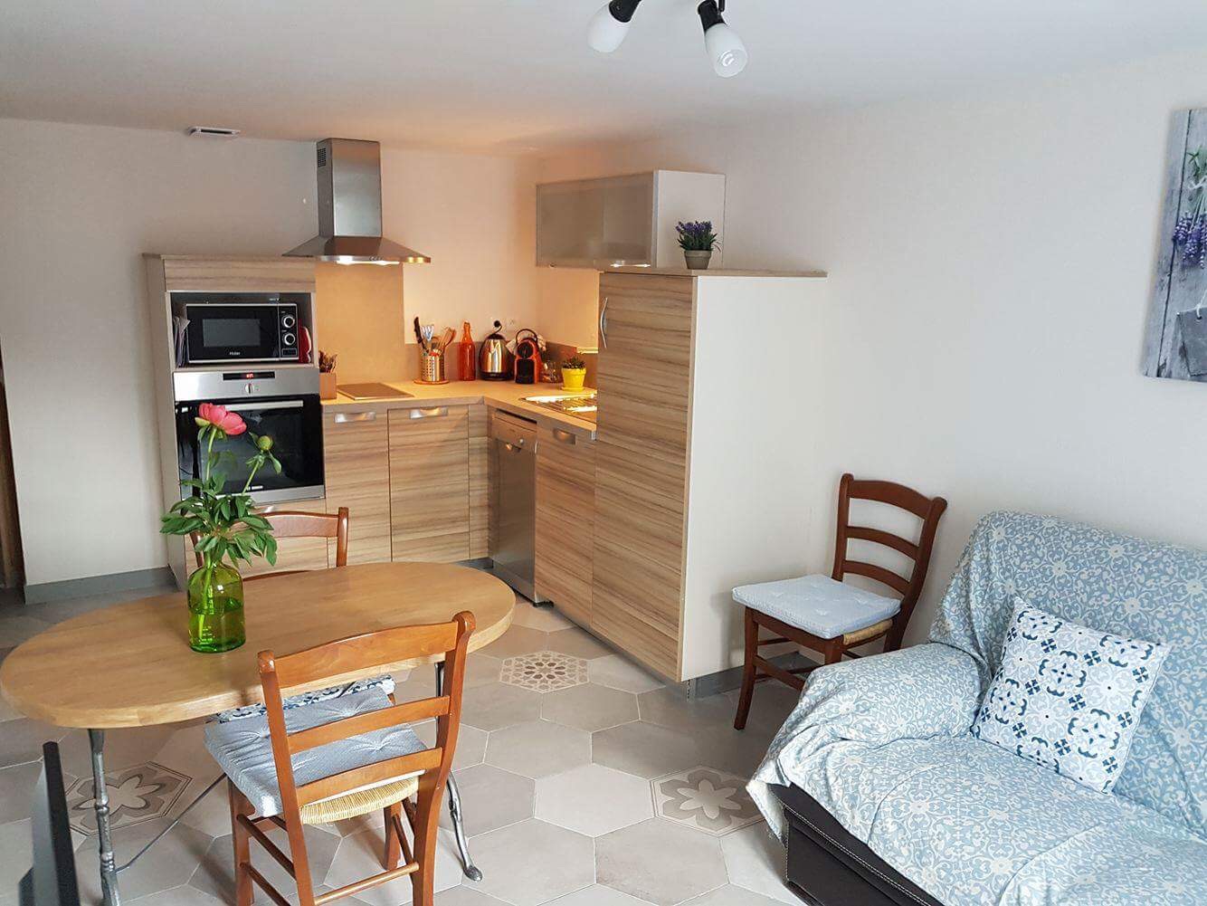 Cuisine/séjour   : cuisine ouverte sur séjour, réfrigérateur, congélateur, four électrique, micro-ondes, lave vaisselle, lave linge, aspirateur centralisé , fer et table à repasser commun, chauffage électrique, TV, internet WIFI, ustensiles de cuisine, produits de ménage de base et ustensiles, mixeur, cafetière Nespresso. canapé lit confortable pour un couchage d’appoint.