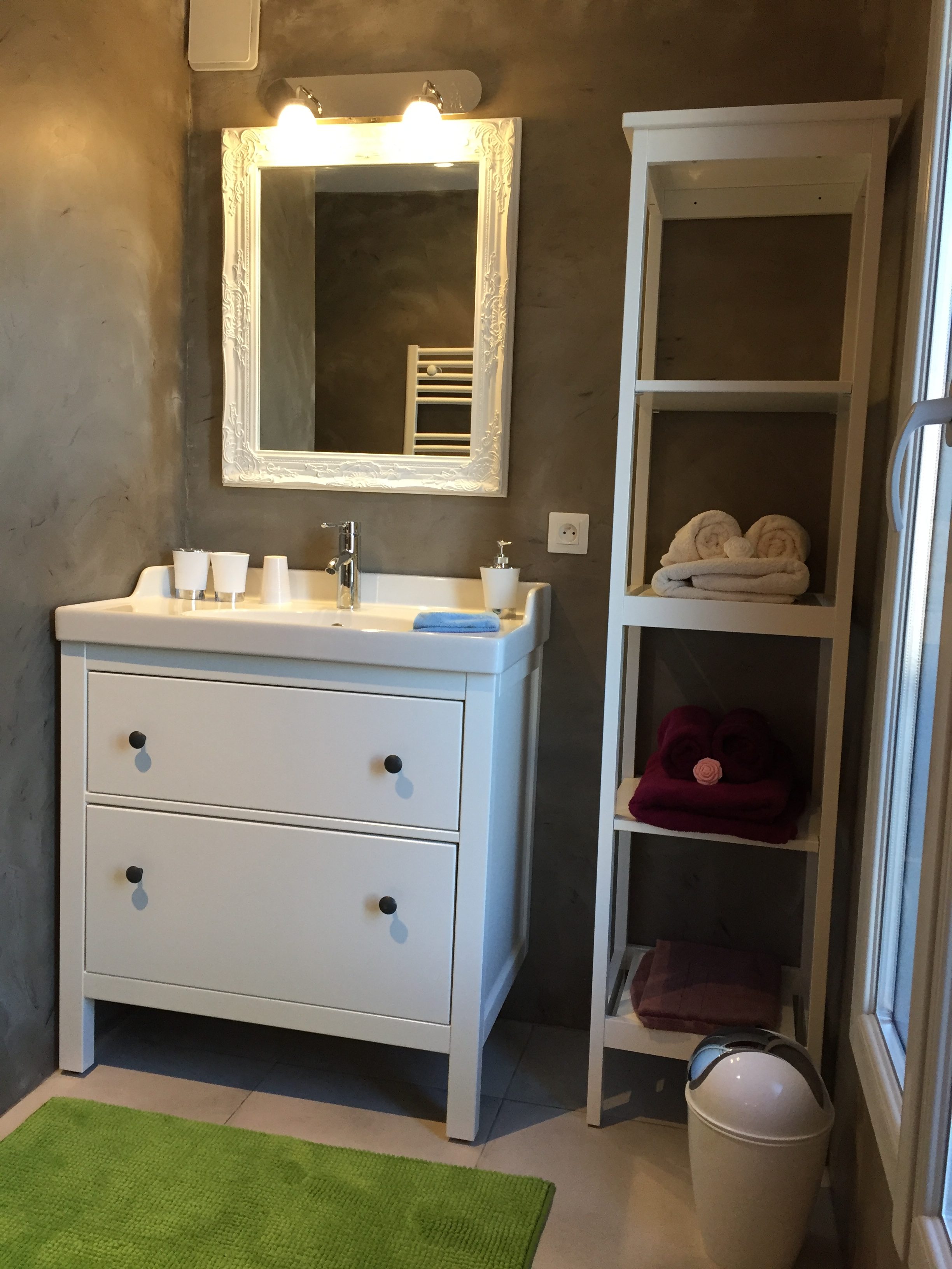Salle d’eau : grande douche à l’italienne, sèche serviette, meuble sous vasque, miroir, sèche cheveux