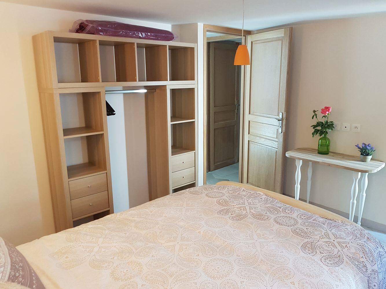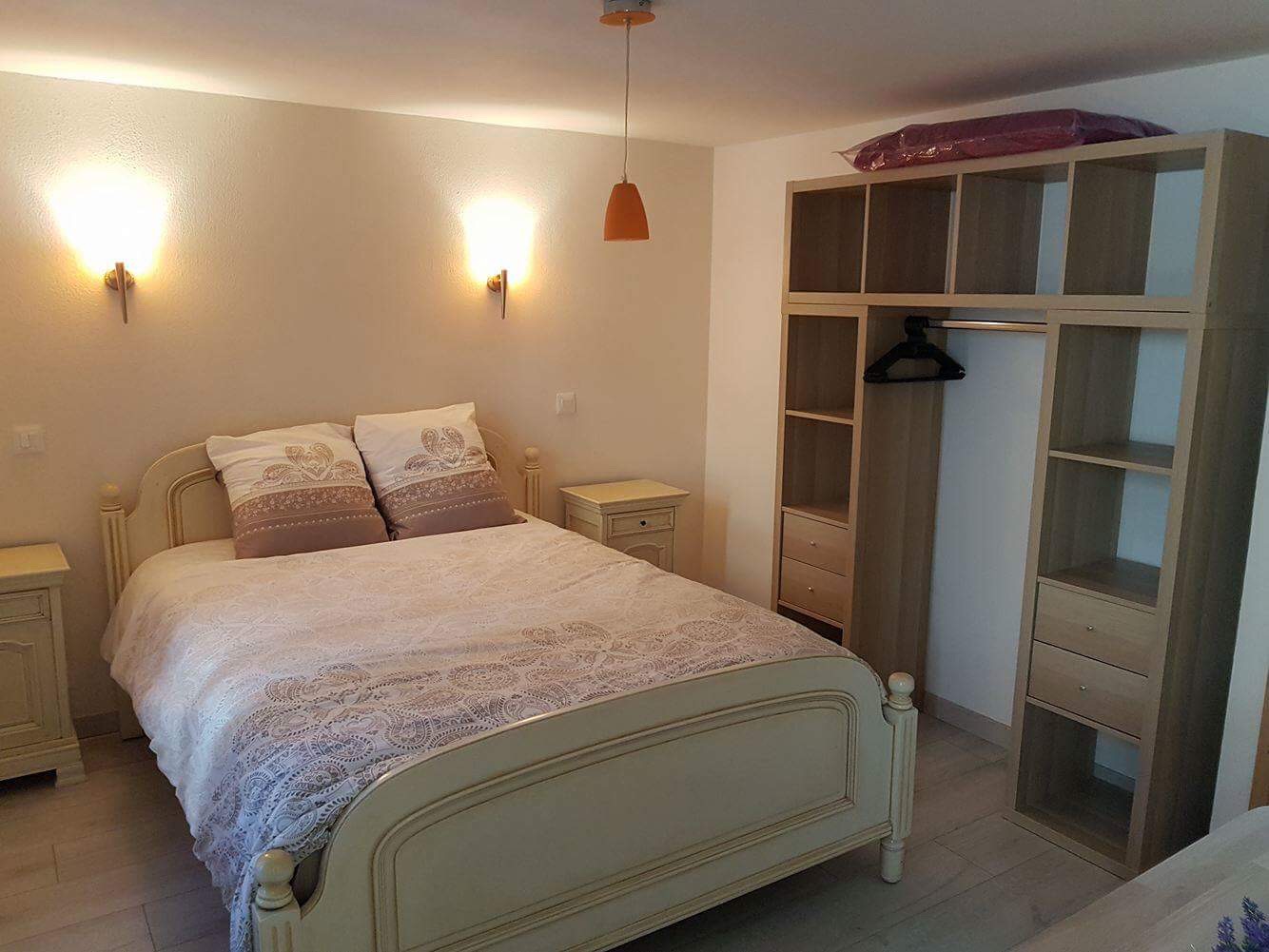Chambre : couchage 160 x 200,  étagères et penderie de rangement.