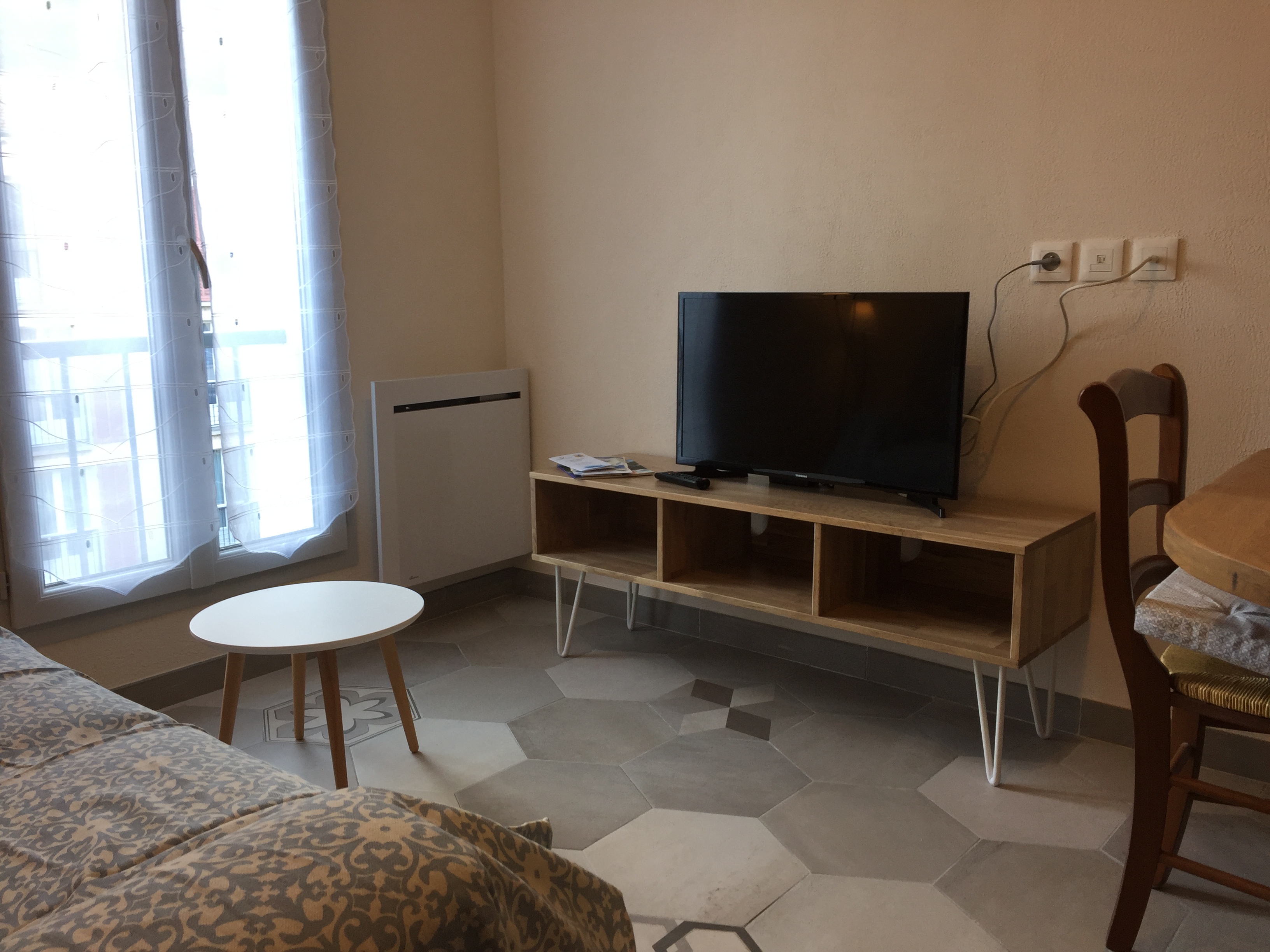 Cuisine/séjour   : cuisine ouverte sur séjour, réfrigérateur, congélateur, four électrique, micro-ondes, lave vaisselle, lave linge, aspirateur centralisé , fer et table à repasser commun, chauffage électrique, TV, internet WIFI, ustensiles de cuisine, produits de ménage de base et ustensiles, mixeur, cafetière Nespresso. canapé lit confortable pour un couchage d’appoint.