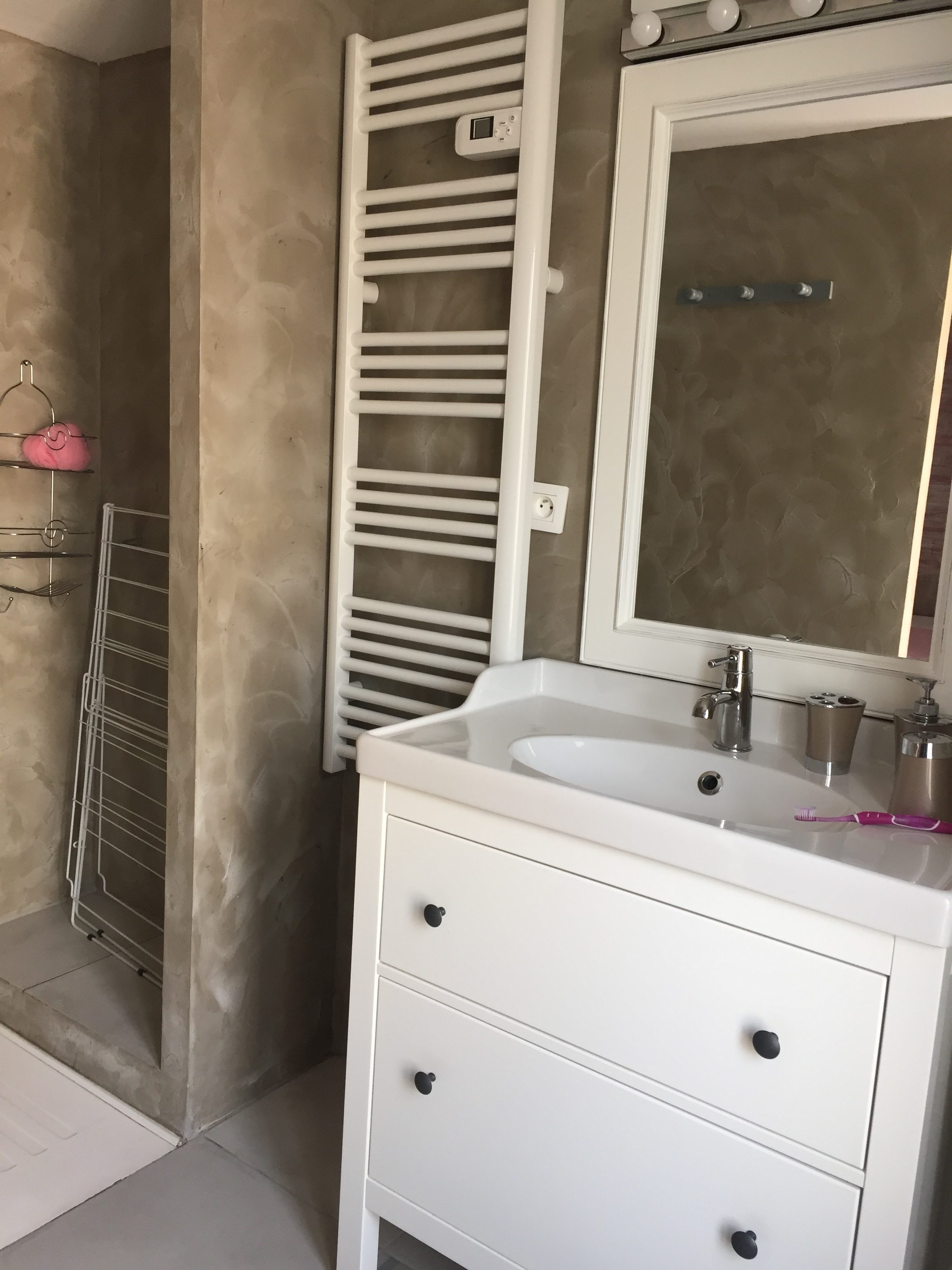 Salle d’eau  :  grande douche à l’italienne, sèche serviette, meuble sous vasque, miroir, sèche cheveux